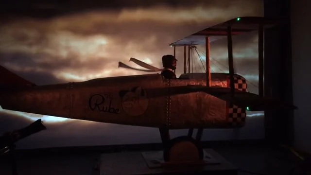Actor Jonathan Campolo flies his bi-plane while Luke Alie manipulates the scarf
